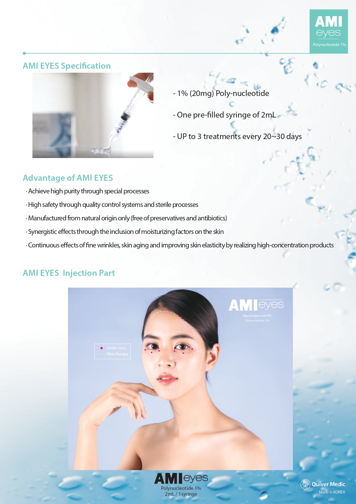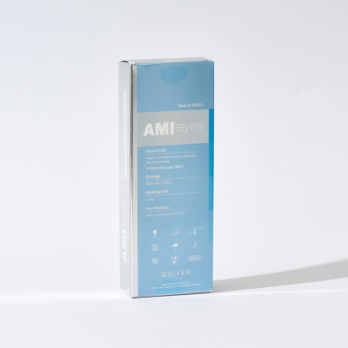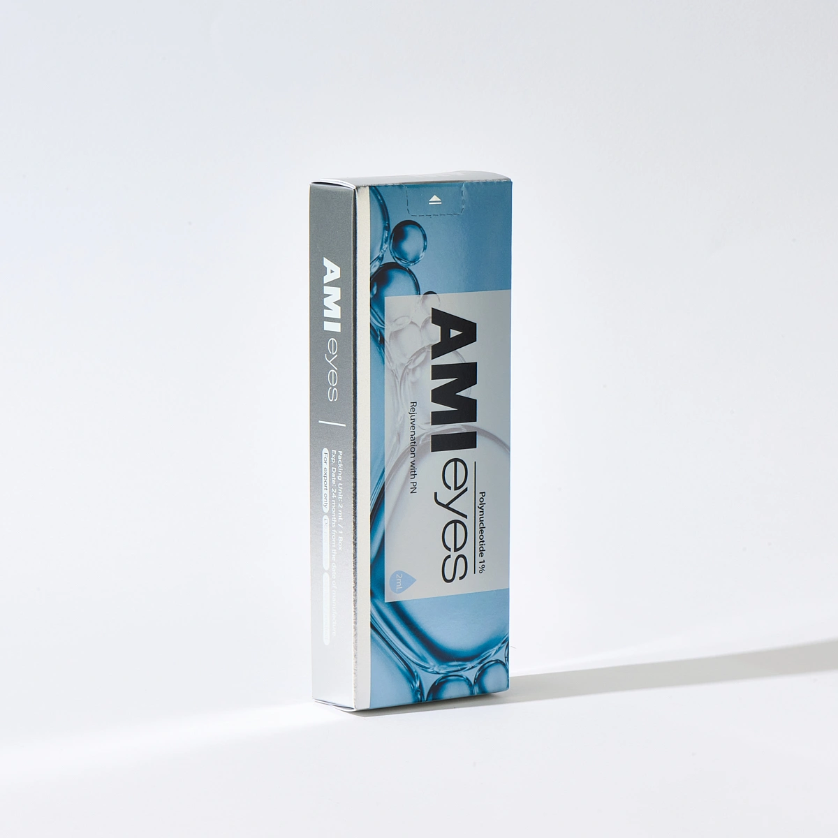 Designed for the delicate peri-orbital region, the Ami Eyes skin booster is used in mesotherapy-style injections to address fine wrinkles, under-eye texture change, and post-acne irregularities while supporting overall rejuvenation. Indicated for the infra-orbital/tear-trough area, it is supplied as a pre-filled 2 mL syringe containing 1% polynucleotide (20 mg) derived from salmon milt and refined to a specific molecular size for dermal use.